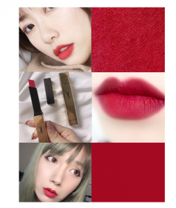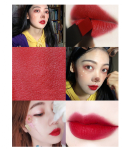 樱桃红偏玫红色,有一丢丢蓝调,显白有气场!!冷皮涂真的肥肠好看了,御姐范十足,很多韩剧女主都喜欢用这个颜色,上唇真的非常漂亮了。