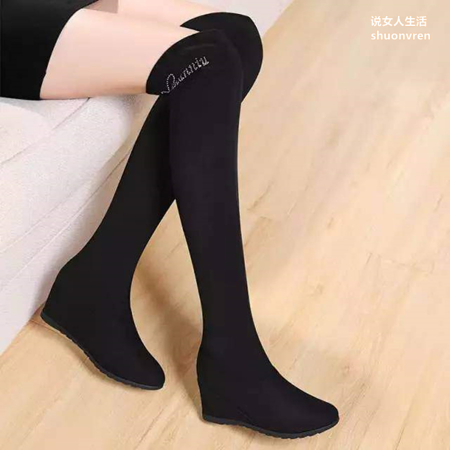 新型汉版高和长靴,时尚现代防水台的设计,舒适的通风,特别适合冬天的黑色羽绒服,表现出更加沉稳的气质。