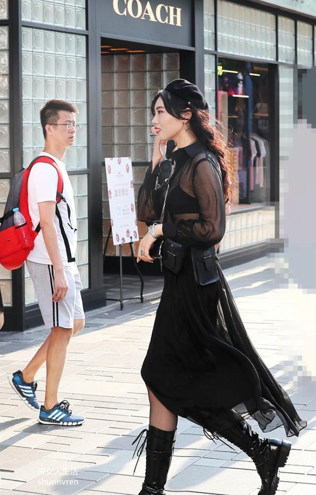 这个漂亮女人的匹配突出了她的个性。她选择的长筒靴是黑色皮革,款式很厚,带子从上到下。这位美丽的女士配了一条黑色的长裙,裙子是用纱布做成的,有一种模糊的透气性。裙子的底边是多边形,属于波西米亚风格。这个漂亮的女人还戴着一顶黑色花呢帽子。这是浓墨重彩的结合。它有向夏日宣战的味道,非常有特色。
