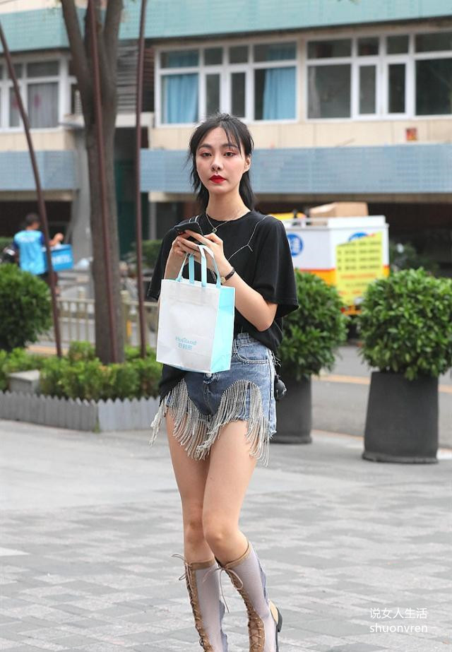 这位美丽的女士选择了一双网眼样式的空靴子。由于靴子的颜色接近肤色,它凸显了美女修长的双腿,使其更容易搭配全身。这位美丽的女士穿着长流苏牛仔短裤和黑色针织短袖t恤。有了这么简单的搭配,美丽的女人绝对美丽,自然成为夏日的一道美丽风景。