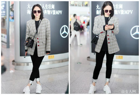 董璇身穿拼色格子图案西服,英伦复古风韵中尽展潇洒空气之感,外套搭配黑色针织衫,简约干脆利落又空气时尚潮流,下身穿黑色紧裤,秀出挺直修长美腿,干净利索干脆利落中产生微微岗位风采,裤腿翻卷,外露银白色的里衬,微露嫩白脚裸,突显质感,干脆利落时尚潮流中不无微微小性感迷人,脚蹬白色坡跟运动鞋,拉升身型,休闲娱乐韵味十足,鼻梁骨发布着黑色太阳眼镜,帅酷时尚潮流,外露璀璨的微笑,非常具备感染力。