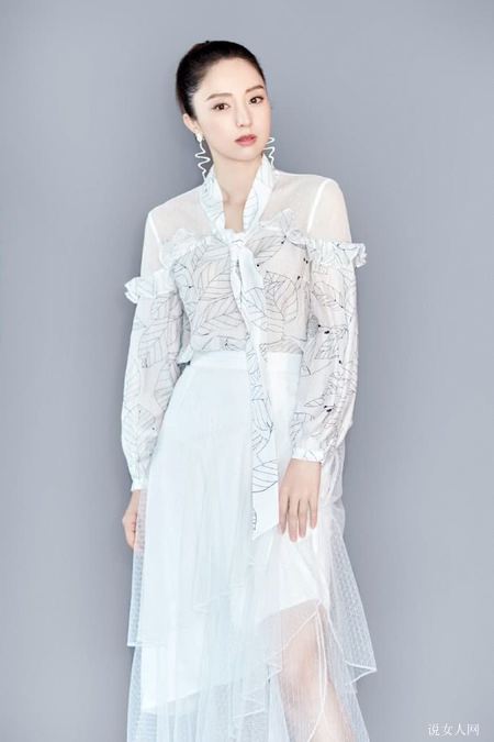 董璇上身穿薄纱印花衬衫,洒脱唯美意境,垂顺飘带装饰设计,黑木耳花边图刻画,青春年少显年轻,增加微微柔美讨人喜欢气场,下半身配搭白色薄纱半身裙,具备薄透視感,嫩白脚部皮肤隐约可见,表露微微小性感迷人,灵气飞扬。