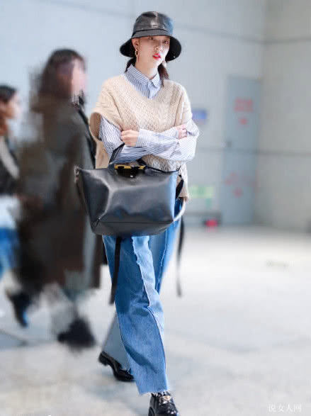 人们一起来看一下宋妍霏的这套时髦的造型设计吧。一件淡蓝色的条纹衬衫累加搭配了一件浅米白色的套头毛衣背心,視覺上提高了总体造型设计的质感。冬季还可以搭出自身的小巧思,大伙儿快点儿学起來,道别初冬的枯燥乏味时尚!宋妍霏下身搭配了一条深蓝色与浅蓝色拼凑的牛仔裤子,防寒保暖又时尚。
