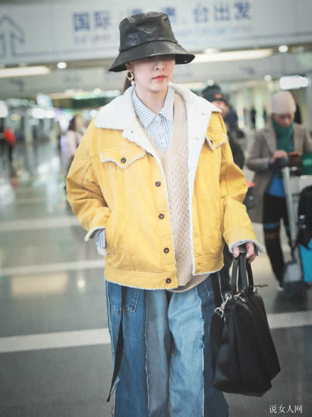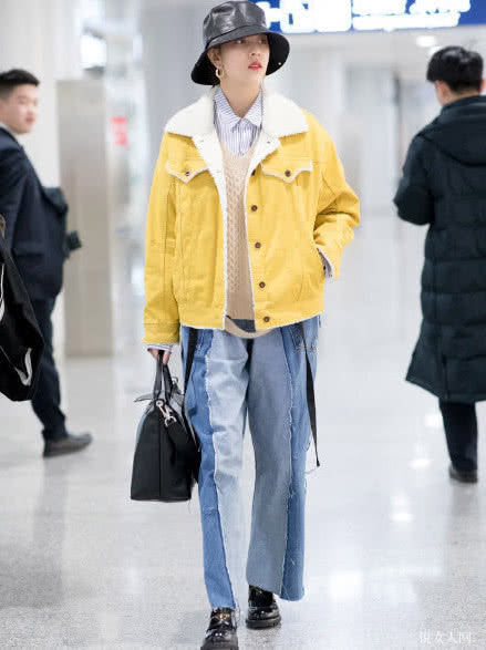 黄色的颜色与外套搭配的深蓝色产生拼色,太时尚了,全屏幕的青春年少与魅力。色度较为高的黄色给严寒的初冬增加了溫暖,造成了視覺上的无比舒适度。不愧为是“亚洲第一美女”,是否看她穿的这套造型设计也很想那样来搭配。