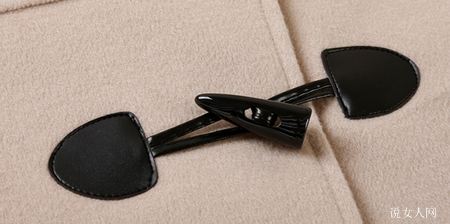 牛角扣大多数由复合树脂配色铸造而成,其造型设计神似水牛角,再由一根牵绳扣住。冬季服装大衣应用到了牛角扣以后,成件大衣的造型设计会看上去更丰富多彩,也很有学院风格,看起来很年青。