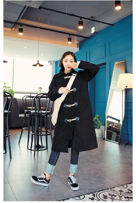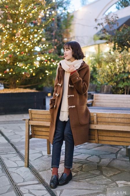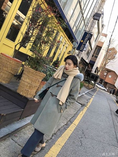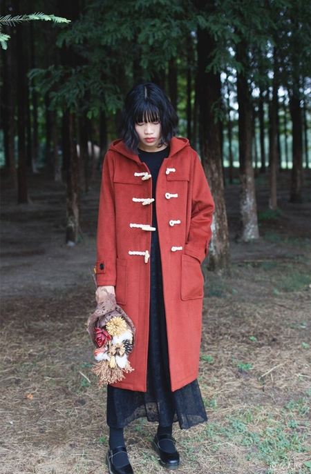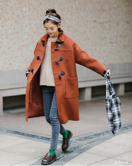 墨绿和酒红色的牛角扣大衣最具备复古时尚的调子,并且也很有文艺范儿气场,外套搭配长连衣裙尽展溫柔和雅致的气场,很有气质女神儿哦。