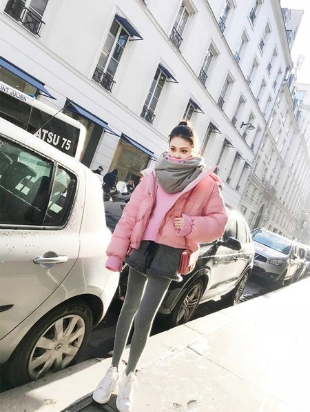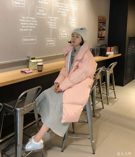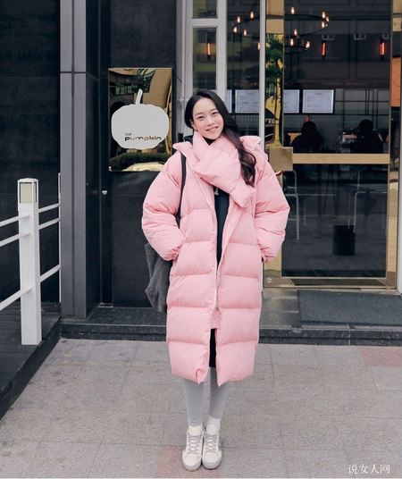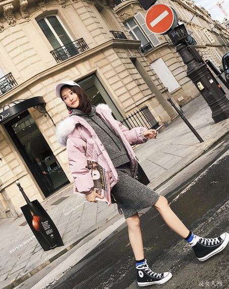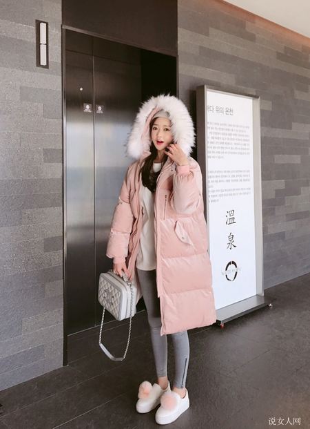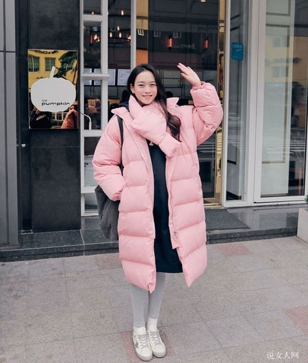 较为韩风儿的女孩喜爱穿粉色面包服搭配灰色打底袜,这类搭配既舒服防寒保暖,还能看起来脚部十分苗条,内置萌萌达。